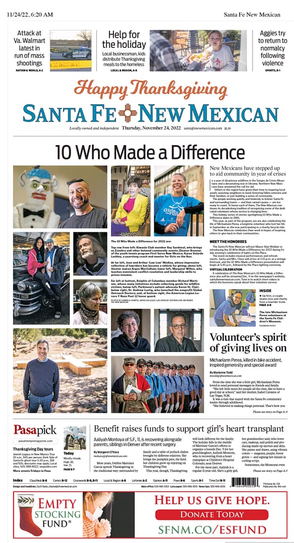 The Santa Fe New Mexican will join Mayor Alan Webber in introducing the 10 who Made a Difference for 2022 during Friday evening's celebration of lights on the Plaza.