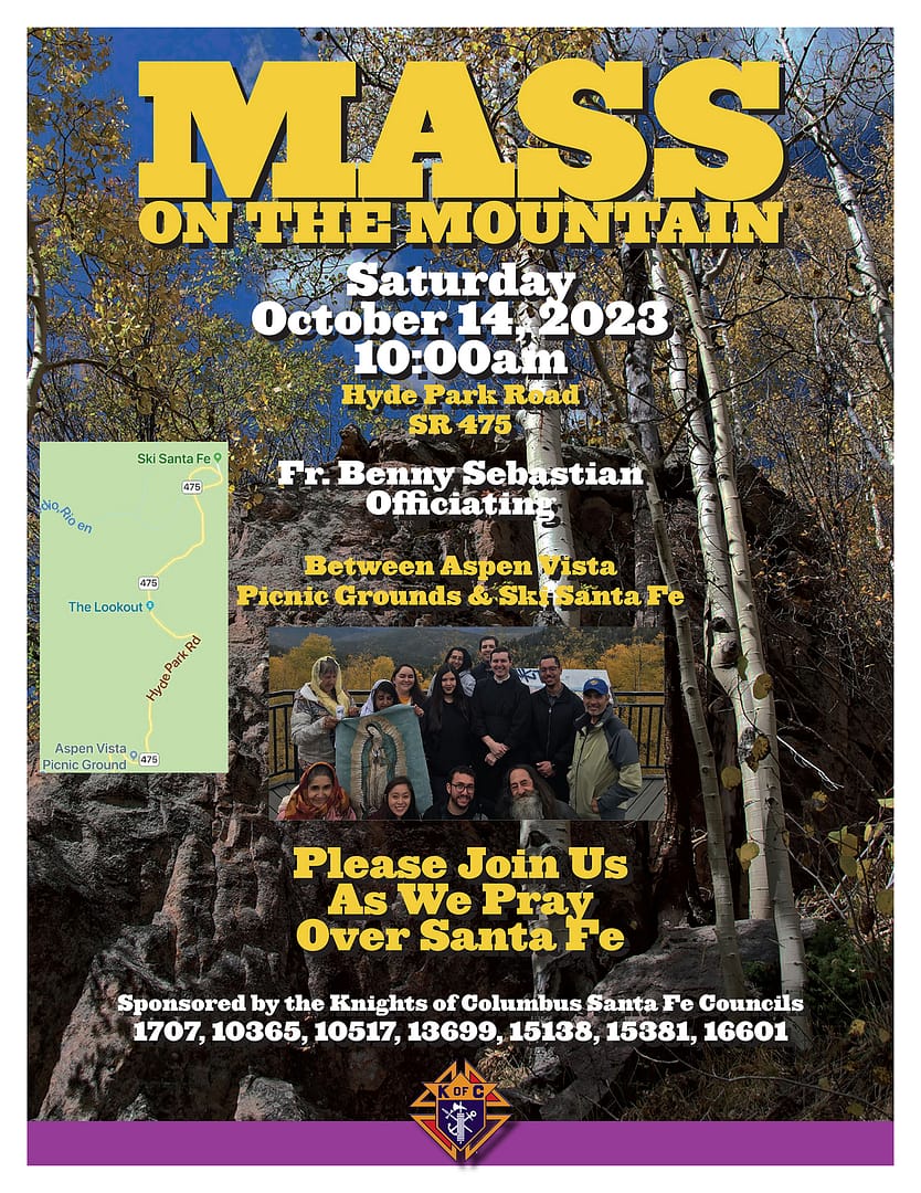 Father Benny Sebastian CST, Ministerial Assistant of SMDLP will be saying the Mass on the Mountain on October 14th at 10 AM at the Lookout which is a half mile below Ski Santa Fe.